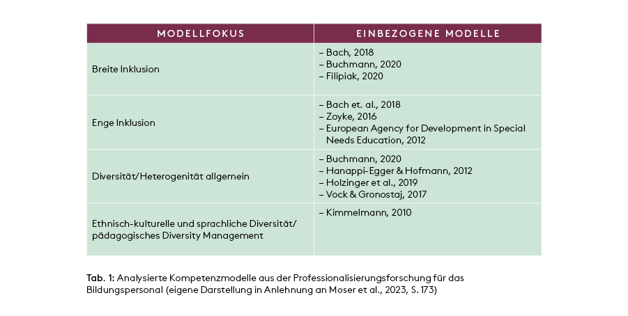 Die einbezogenen Modelle haben sowohl die verschiedenen Inklusionskonzepte als auch pädagogische Konzepte zum Umgang mit Diversität/Heterogenität im vorne skizzierten aktuellen Verständnis als Bezugspunkte. Aus Inklusionsperspektive sind dazu Modelle eingebunden, die sich explizit auf den Umgang mit Lernenden mit Behinderung bzw. sonderpädagogischem Förderbedarf beziehen (enges Inklusionsverständnis), als auch solche, die mehrere Diversitätsmerkmale im Sinne der weiten Inklusion umfassen.