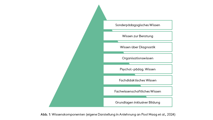 Die Relevanz weiterführender Wissensbereiche in Richtung der Spitze der Pyramide ist hingegen u.a. abhängig von der Umsetzung einer an Inklusion und Diversität orientierten Organisationsentwicklung in der jeweiligen Bildungseinrichtung. Sonderpädagogisches Wissen an der Spitze der Pyramide zeigt die – im Vergleich zu grundlegenden Wissenskategorien geringere – Relevanz spezifischer Expertise über verschiedene Diversitätsmerkmale, Förderbedarfe und geeignete Massnahmen im Umgang mit Lernenden, die diese Merkmale aufweisen. Es ist jedoch wichtig, dass zumindest einzelne Lehrende in einer Bildungseinrichtung darüber verfügen, um entsprechendes Wissen bei der Planung von Lernsettings einbringen zu können.