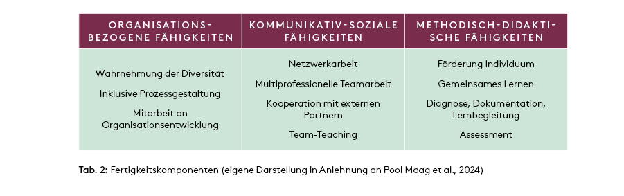 Notwendige Fähigkeiten bzw. Fertigkeiten des Bildungspersonals orientieren sich an einer inklusiven Organisationsentwicklung. Im schulischen Kontext hat sich hier beispielsweise das Modell nach Heimlich (2003) etabliert, welches fünf Ebenen einer inklusiven Schulentwicklung umfasst: inklusives Schulkonzept/Schulleben, multiprofessionelles Team, externe Unterstützungssysteme, inklusionsorientierter Unterricht und individuelle Bedürfnisse der Lernenden.