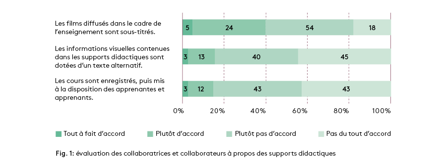 La fig. 1 montre que seule une petite partie des organisations met à la disposition des apprenantes et apprenants des films sous-titrés, des supports didactiques avec des informations visuelles dotées d’un texte alternatif ou des enregistrements des cours. Nous voulions également savoir comment les organisations garantissent l’accessibilité aux contenus didactiques. Tandis que 16 % des organisations interrogées prennent très peu de mesures pour garantir un tel accès, une organisation sur cinq s’efforce de garantir le design universel et tente, selon les indications des spécialistes, de rendre accessibles tous les contenus didactiques pour les apprenantes et apprenants. La majorité des organisations interrogées (64 %) veille à garantir l’accessibilité aux contenus didactiques uniquement en cas de nécessité, une tâche qui, dans huit organisations sur dix, relève de la responsabilité du personnel enseignant.