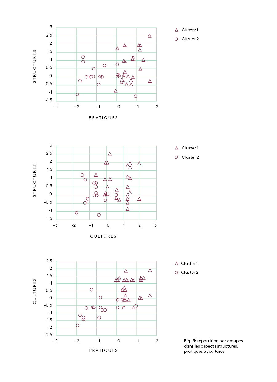 Ci-après, les organisations ont été classées sur la base de leurs caractéristiques dans les différents aspects au moyen d’une analyse en cluster K-Means. Celle-ci a permis d’identifier deux groupes. Après une étude plus approfondie, ces deux groupes peuvent être décrits, sur le plan de la participation numérique, comme des organisations hautement développées (n=27) et peu développées (n=18). Les organisations hautement développées sont celles qui, par rapport aux organisations moins développées, se distinguent particulièrement dans les aspects «pratiques» et «cultures» et, dans une moindre mesure, dans l’aspect «structures». Cela signifie que les structures de la participation numérique (p. ex. sous-titres, formation continue, concepts) présentent un niveau de développement similaire dans les organisations. En revanche, des différences plus marquées existent au niveau des pratiques et des cultures de la participation numérique. La figure 5 montre un aperçu des diagrammes de dispersion, avec les affectations par groupe dans les trois aspects.
